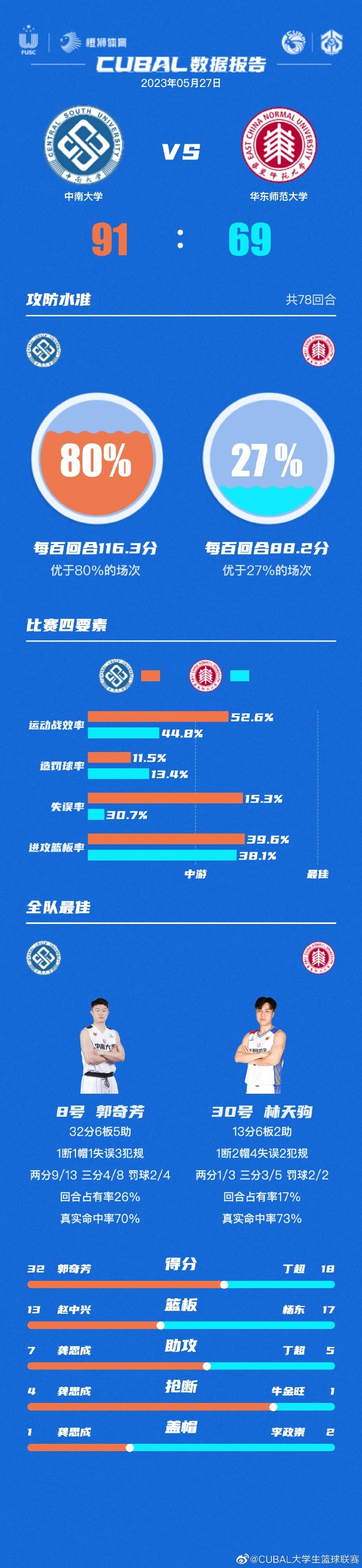 中南大学:郭奇芳32分6板5助,付永康17分6板,张东旭13分,赵中兴10分13板,龚思成17分6板7助4断