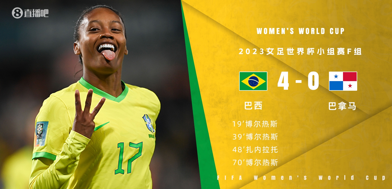 7月24日讯 北京时间7月24日晚19点整,2023年女足世界杯F组首轮展开角逐,巴西对阵巴拿马。上半场博尔热斯“头顶脚踢”梅开二度,下半场扎内拉托扩大比分,博尔热斯上演帽子戏法,玛塔替补登场迎个人第6届世界杯。最终巴西4-0大胜巴拿马,巴西取得本届女足世界杯开门红。F组积分榜方面,巴西积3分位居榜首,巴拿马积0分垫底。