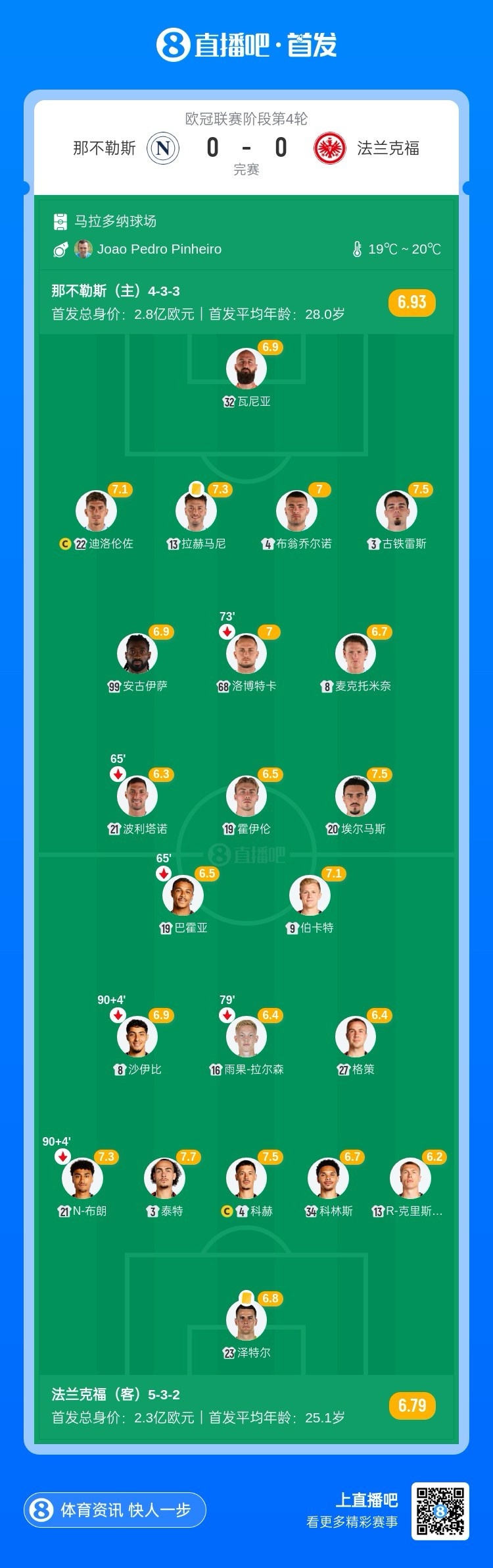 全场比赛结束,那不勒斯主场0-0闷平法兰克福。