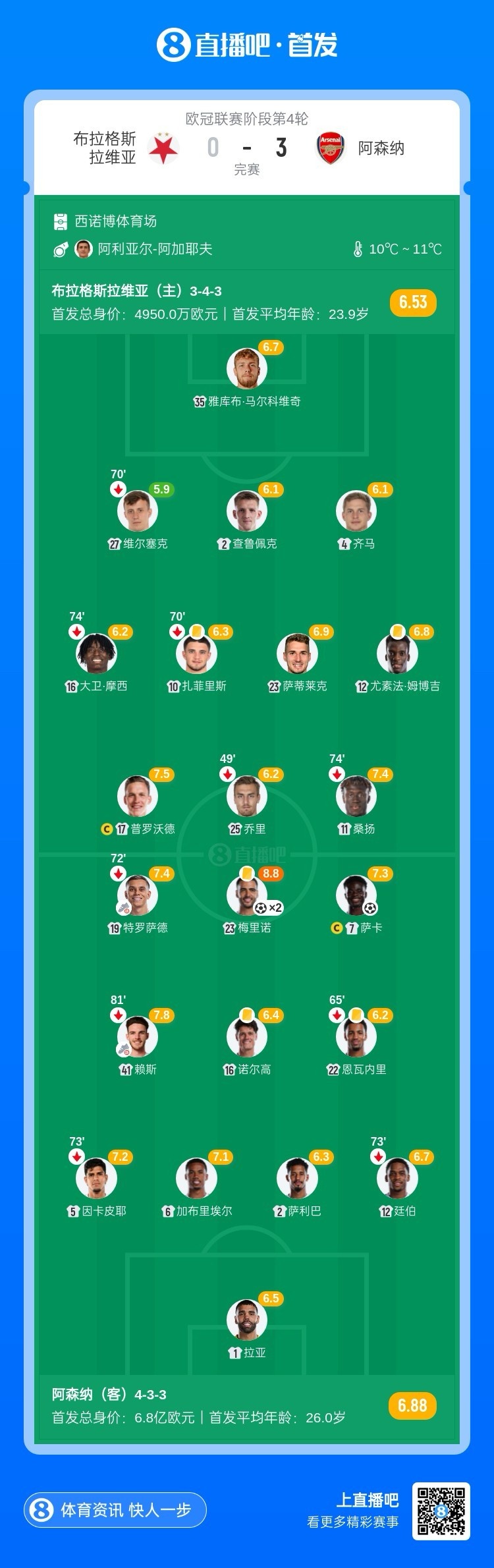 11月5日讯 北京时间11月5日凌晨1时45分,欧冠联赛阶段第4轮,阿森纳做客西诺博体育场对阵布拉格斯拉维亚。上半场,普罗沃德手球犯规送点,萨卡点射首开纪录。阿森纳半场1-0领先布拉格斯拉维亚。下半场,梅里诺打进两球,15岁零308天的道曼替补登场,成为欧冠有史以来最年轻登场球员。最终阿森纳3-0击败布拉格斯拉维亚,各项赛事取得十连胜+欧冠4轮全胜,连续8场零封对手!