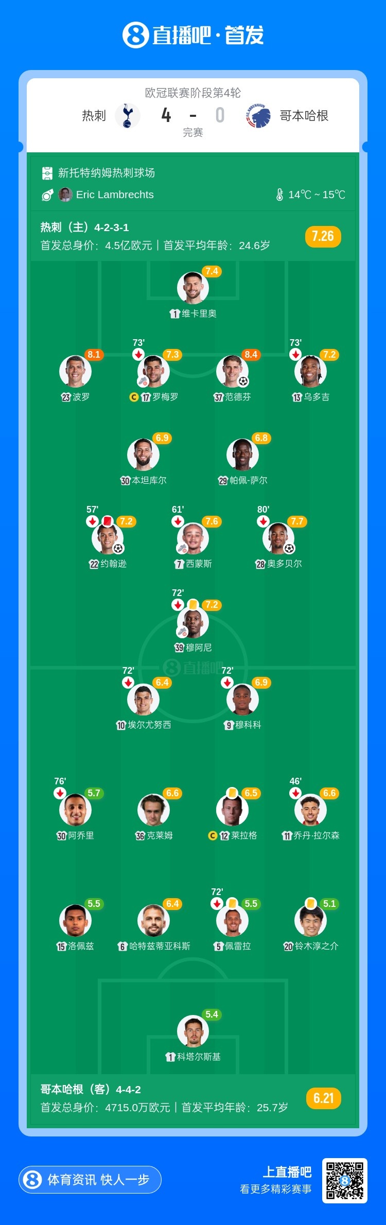 止2连败!十人热刺4-0哥本哈根 范德芬全场奔袭一条龙约翰逊直红
