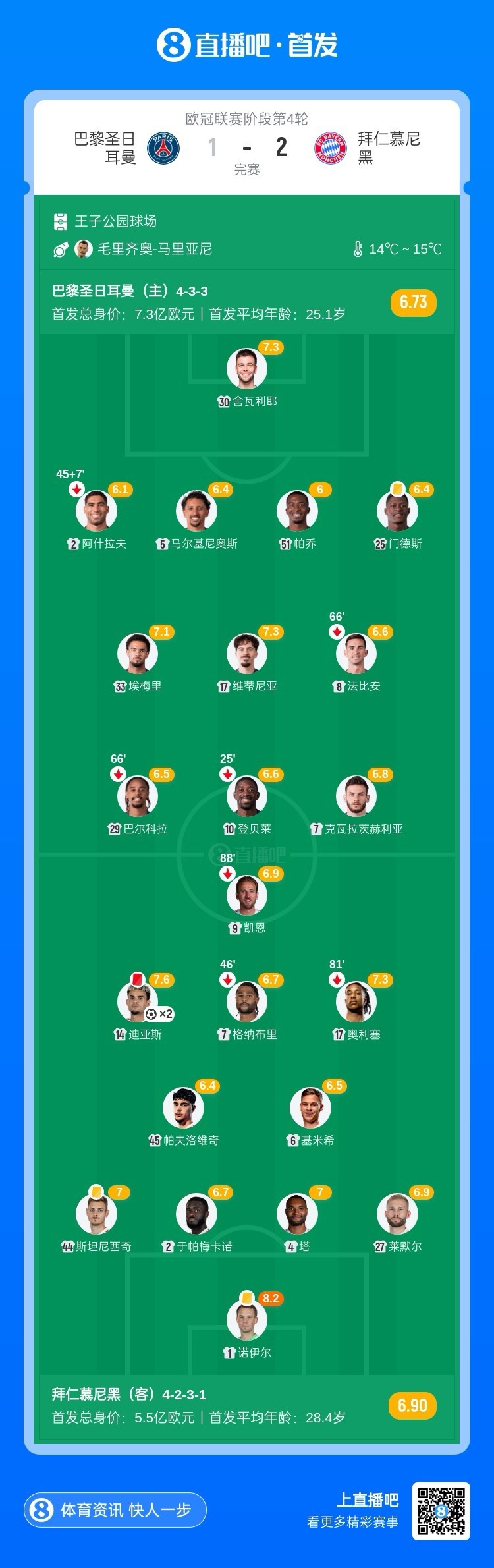 全场比赛结束,十人拜仁慕尼黑客场2-1战胜巴黎圣日耳曼。