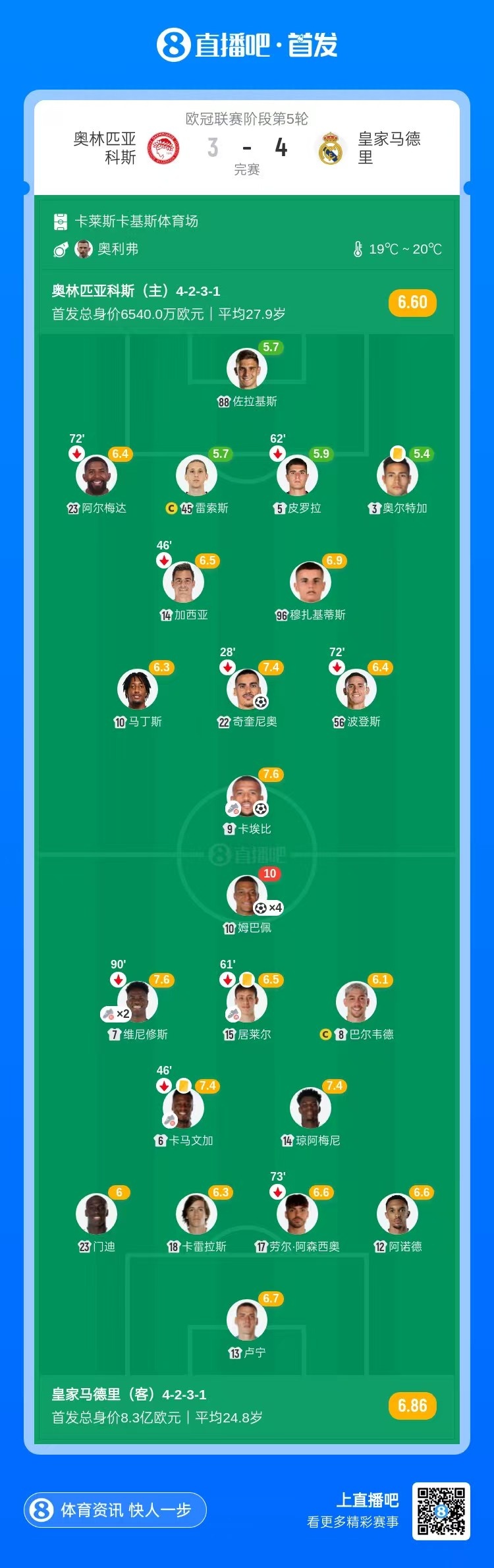 有惊无险!皇马4-3奥林匹亚科斯 姆巴佩大四喜维尼修斯助攻双响