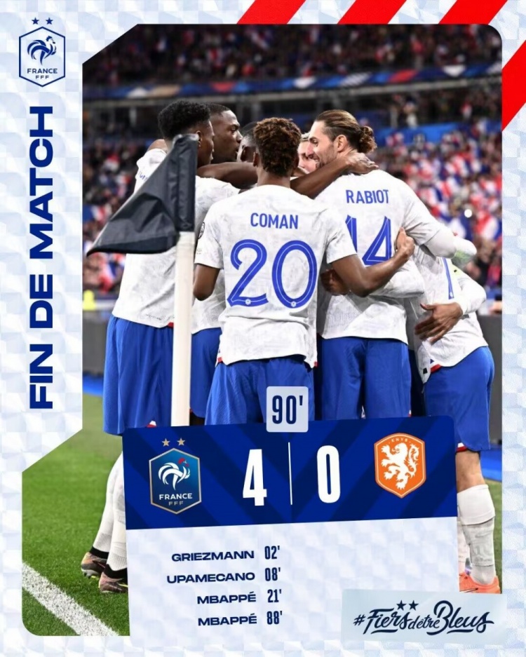 3月25日讯 北京时间3月25日凌晨3点45,欧洲杯预选赛B组首轮,法国主场迎战荷兰。上半场比赛,格列兹曼开场2分钟闪击破门,于帕梅卡诺、姆巴佩建功。下半场迪亚比破门被吹,姆巴佩再下一城,最后时刻德佩失点。最终全场比赛结束,法国主场4-0荷兰。