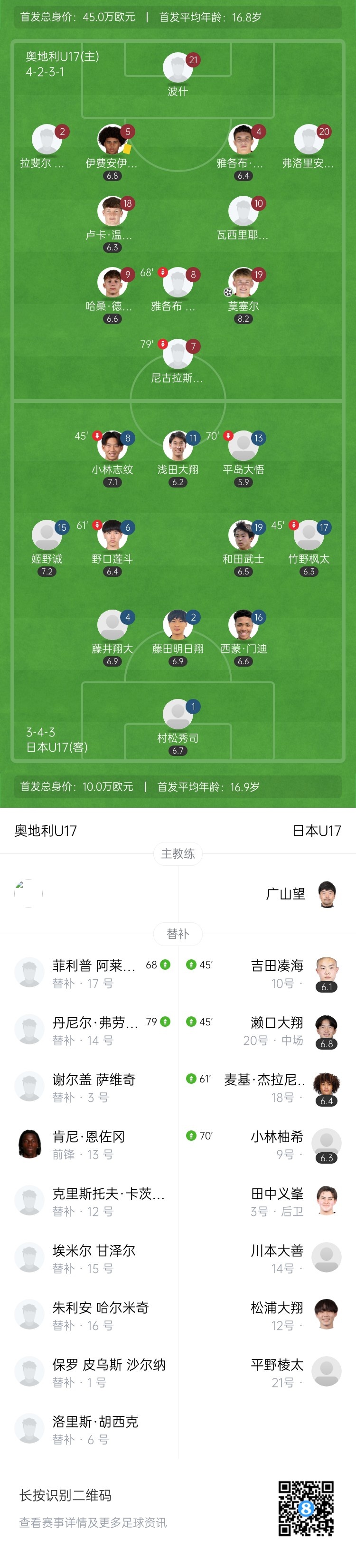 11月21日讯 北京时间11月21日晚上20:30,U17世界杯1/4决赛,奥地利U17对阵日本U17。上半场,平岛大悟失良机。下半场,莫塞尔冷射建功,哈桑·德希什库失点。全场结束,奥地利U17以1-0战胜日本U17。