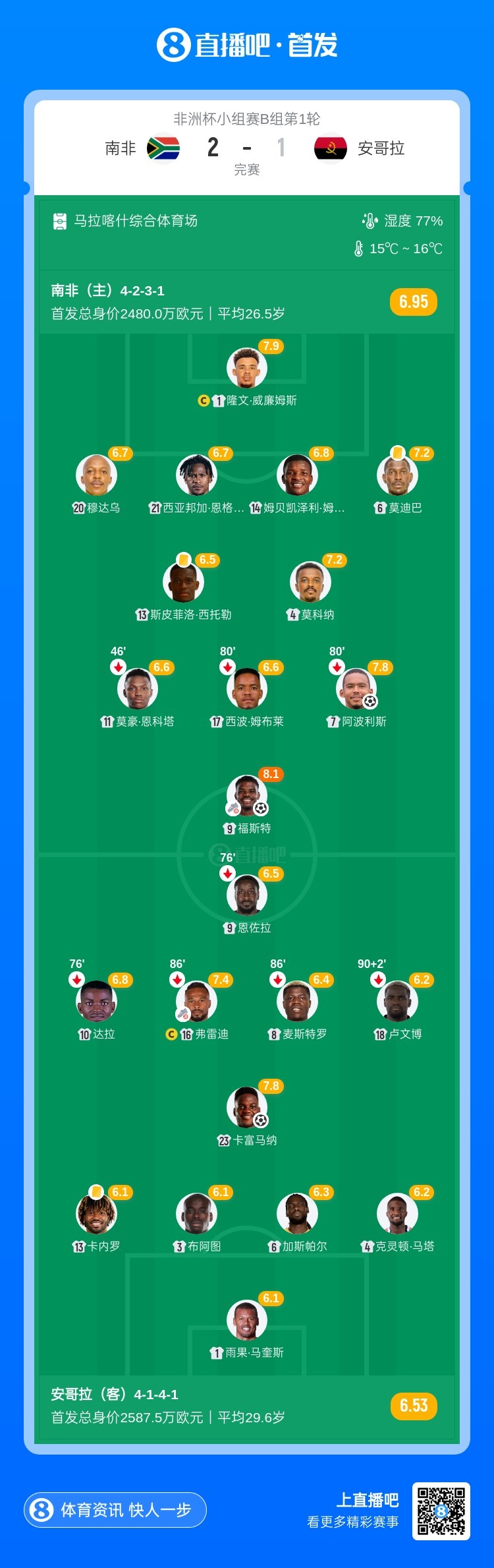 第79分钟,南非队左路攻势,莫雷米禁区前沿接球顺势一做,福斯特跟上右脚兜射破门!南非2-1再次领先安哥拉↓