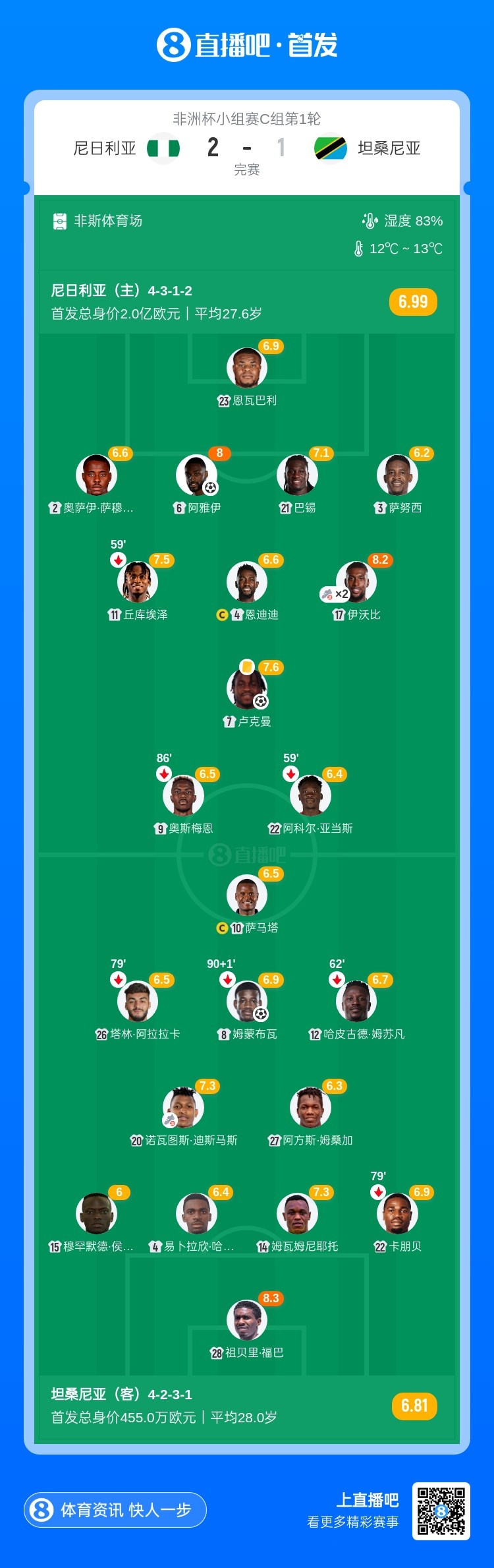 开门红!尼日利亚2-1坦桑尼亚 伊沃比助攻双响 卢克曼远射建功