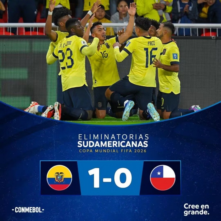 世预赛-厄瓜多尔1-0智利升至第5 梅纳补射破门制胜