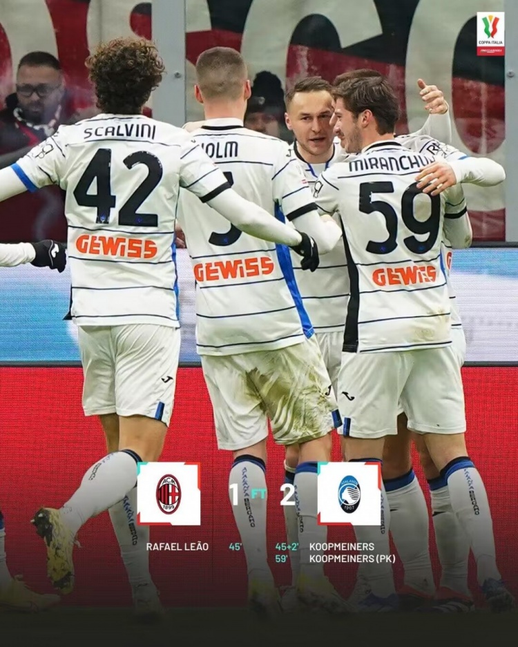 1月11日讯 北京时间1月11日凌晨4:00,意大利杯1/4决赛,AC米兰迎战亚特兰大。上半场穆萨助攻莱奥破门,库普梅纳斯马上为亚特兰大扳平比分,两队暂1-1战平;下半场希门尼斯送点,库普梅纳斯罚进,最终AC米兰1-2被亚特兰大逆转,无缘晋级四强,亚特兰大半决赛将对阵佛罗伦萨。