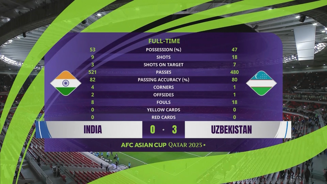 亚洲杯-乌兹别克斯坦3-0印度2战4分小组第2 印度2连败B组垫底