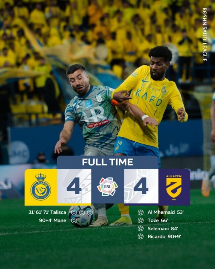 沙特联-利雅得胜利4-4遭哈森姆读秒绝平 胜利4次领先遭副班长逼平
