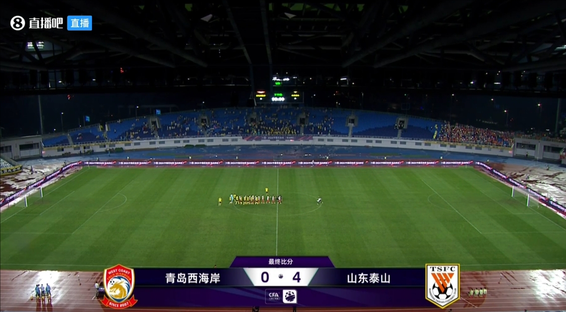 下半场补时2分钟,西海岸0-4山东泰山。