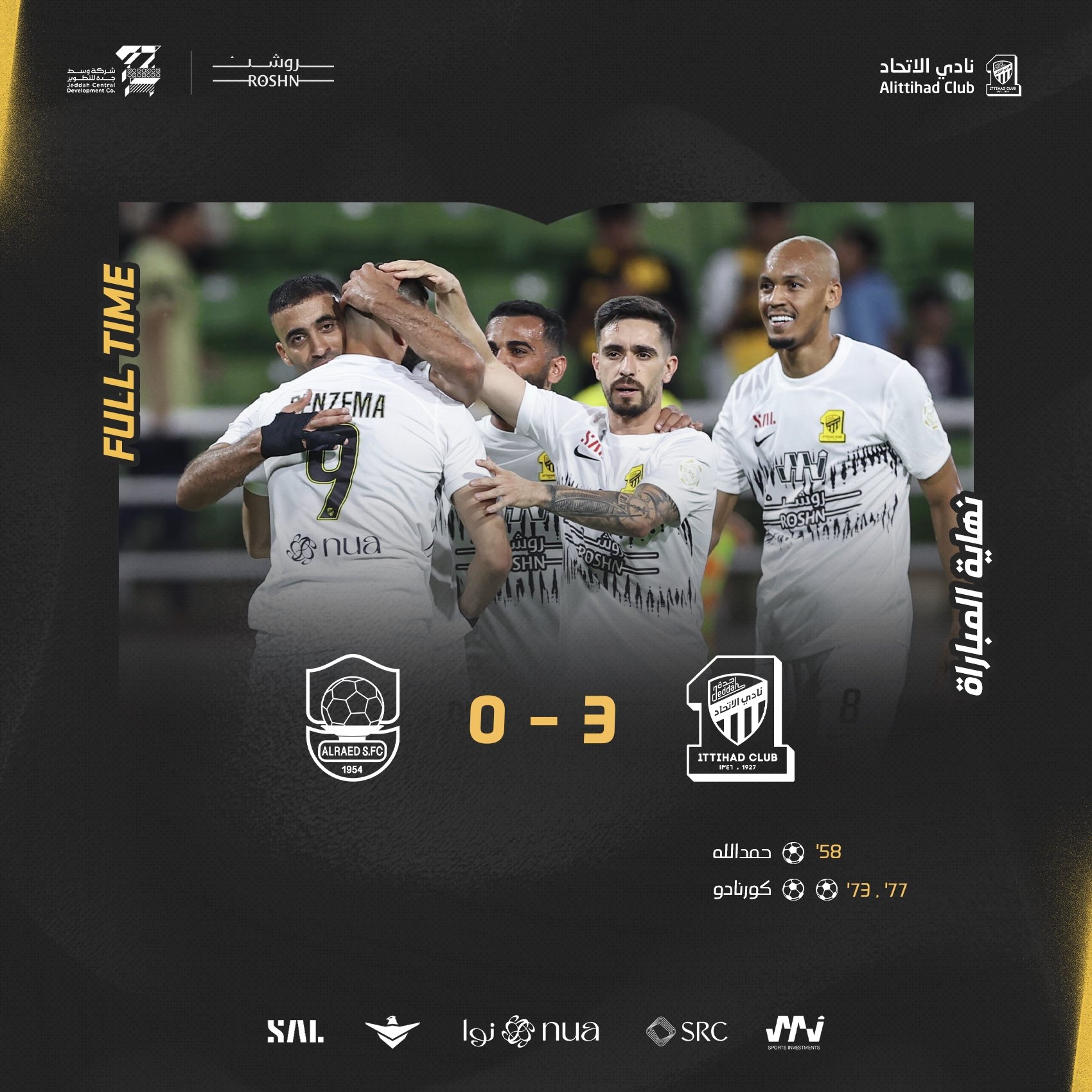 吉达联合首发:34-格罗赫、33-奥拉扬、20-沙拉希利、13-山凯蒂、95-巴沙特、2-法比尼奥、7-坎特(82’ 6-苏尔坦)、10-科罗纳多、90-罗马里尼奥、99-哈姆达拉、9-本泽马