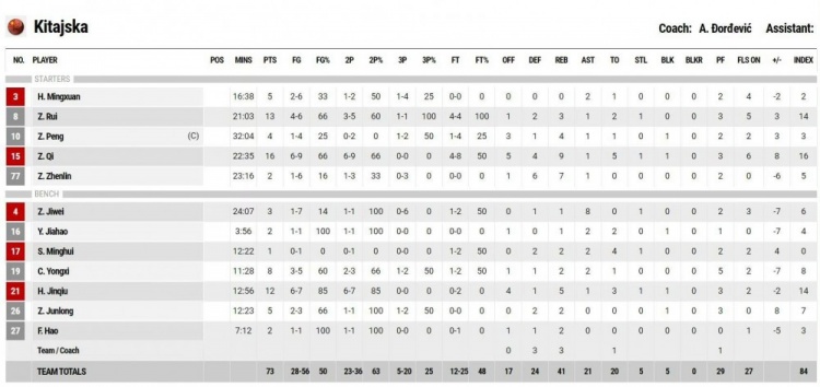 中国男篮数据:周琦16分9板,胡金秋12分5板,赵睿13分,赵继伟3分8助,崔永熙8分