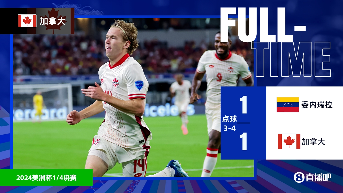 全场比赛结束,两队90分钟战成1-1,点球大战,加拿大4-3委内瑞拉。最终加拿大总分5-4淘汰委内瑞拉。