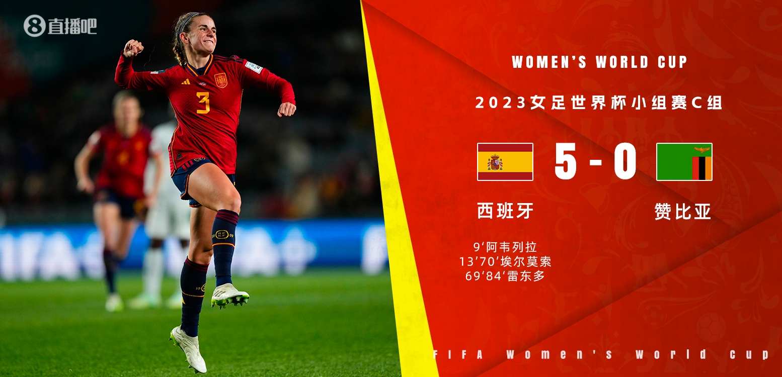 女足世界杯-西班牙5-0赞比亚两连胜携手日本小组出线 赞比亚2战丢10球