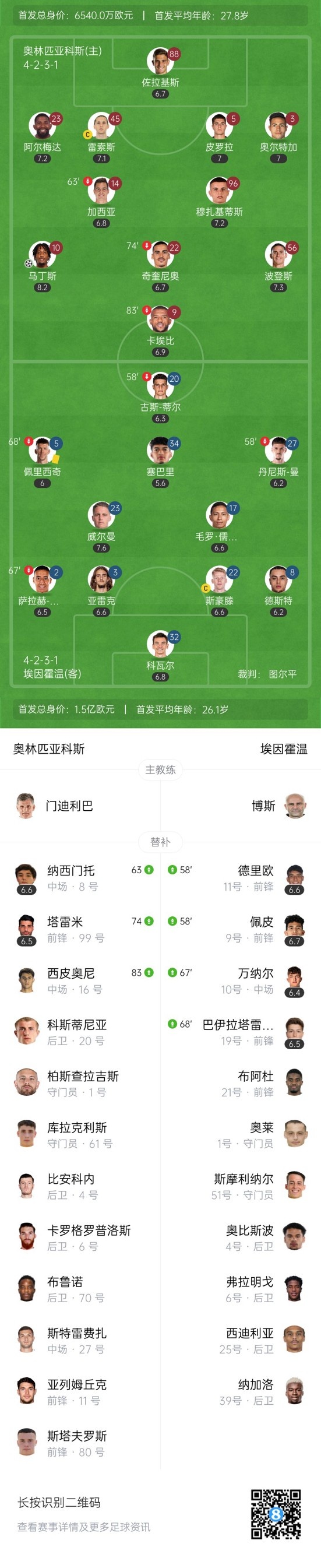 上半场补时2分钟,奥林匹亚科斯1-0埃因霍温。