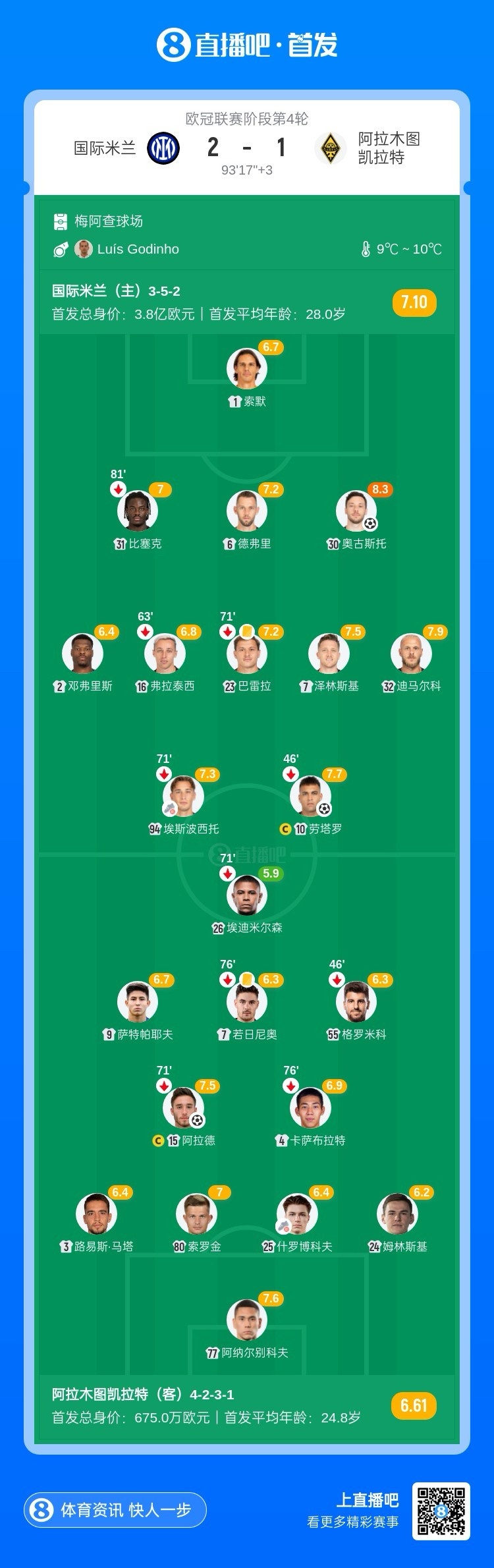 全场比赛结束,国际米兰主场2-1战胜阿拉木图凯拉特。