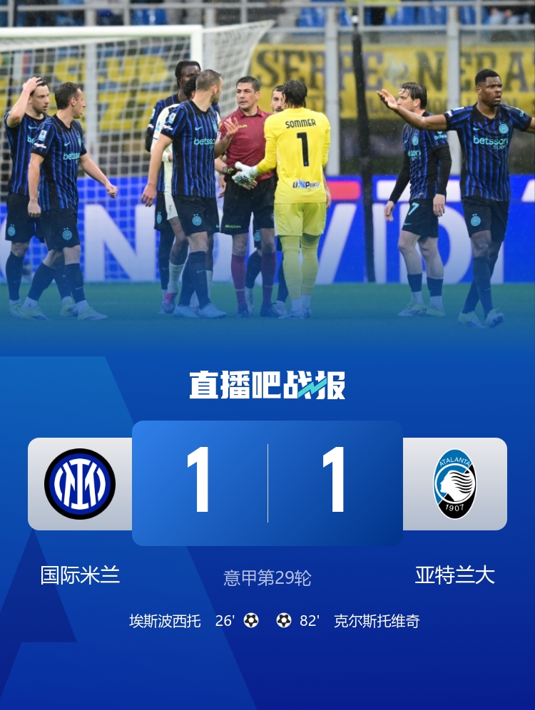 近5场1胜!国米1-1亚特兰大先赛8分领跑 齐沃染红埃斯波西托破门