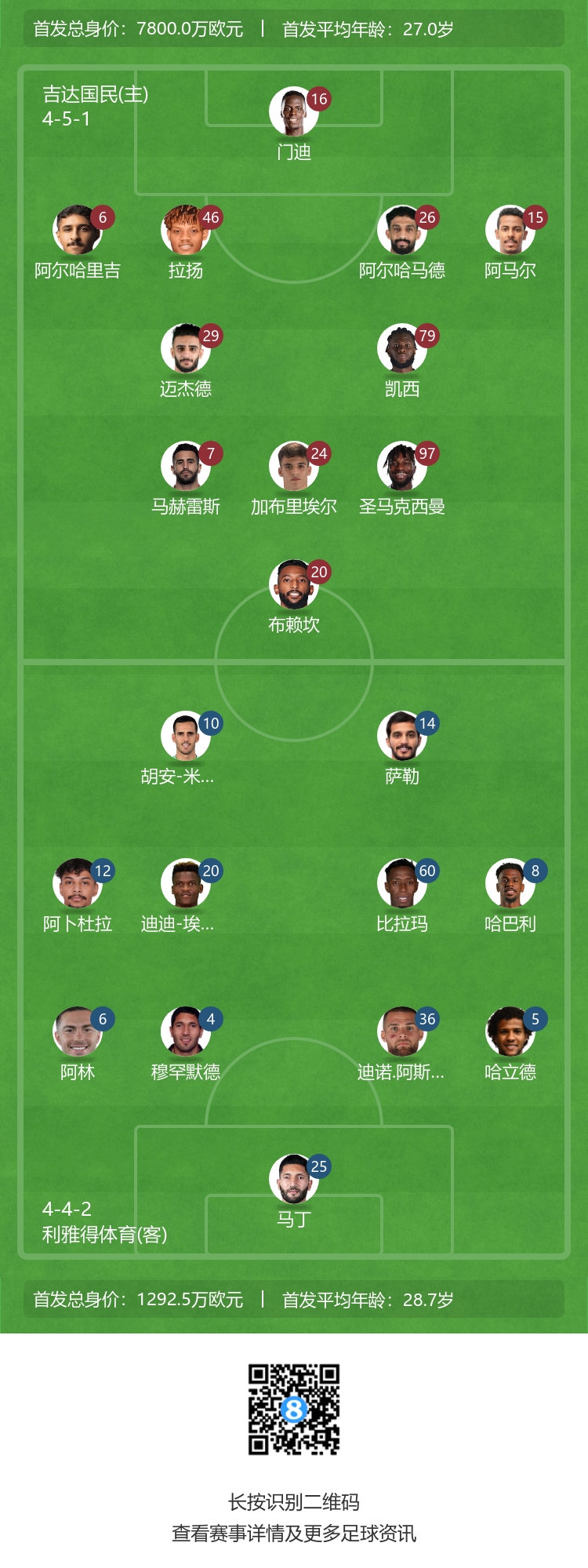 吉达国民首发:16-爱德华-门迪、6-胡拉吉、26-法赫德-哈马德、46-赖扬-哈默德、15-阿马尔、24-维加、29-穆罕穆德-马吉哈德、79-凯西、7-马赫雷斯、97-圣马克西曼、20-布赖坎