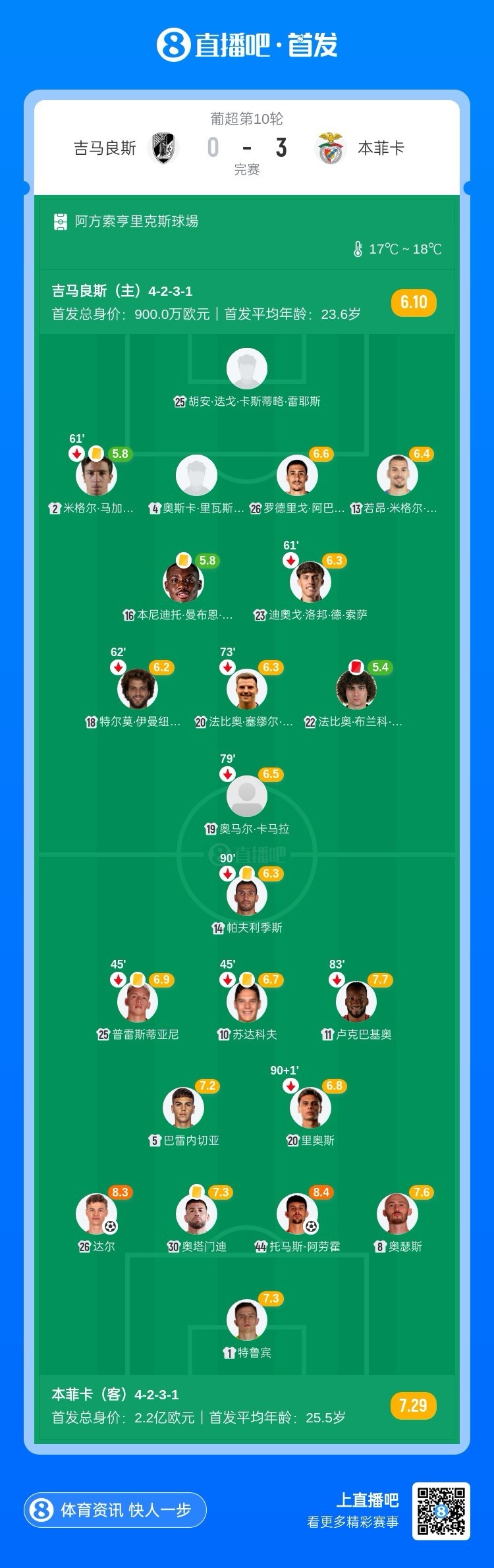 全场比赛结束,本菲卡客场3-0完胜十人吉马良斯。