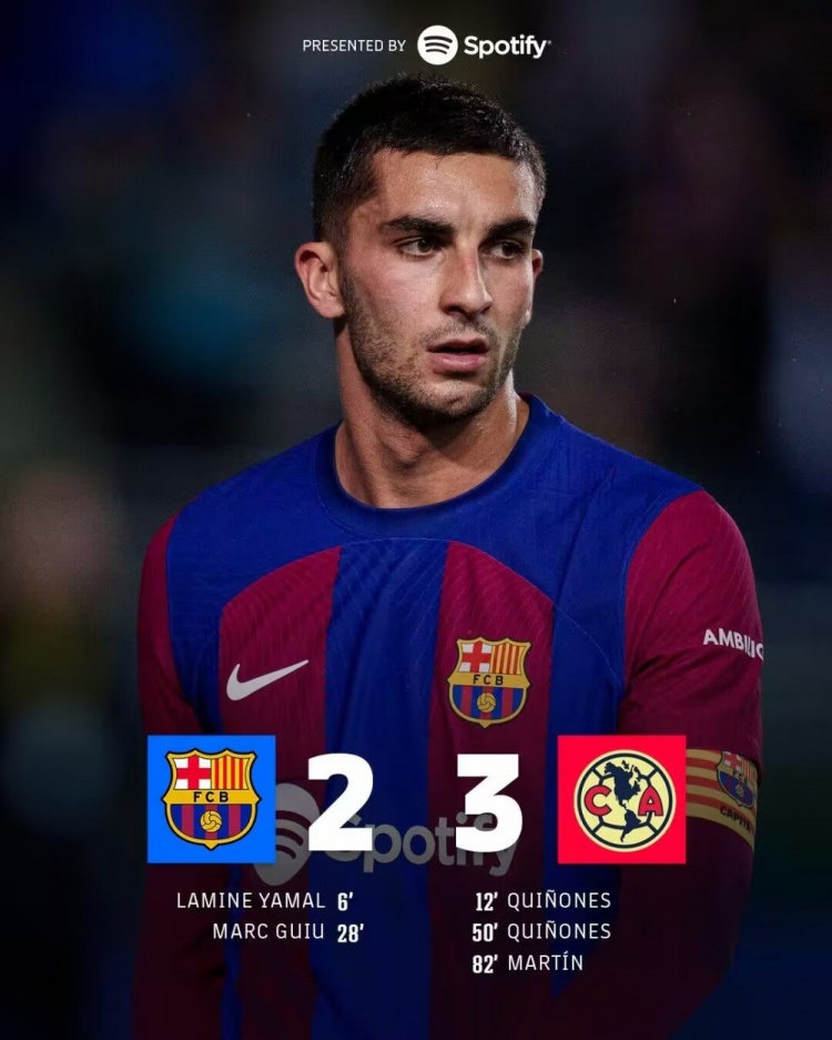全场比赛结束,巴塞罗那2-3墨西哥美洲。