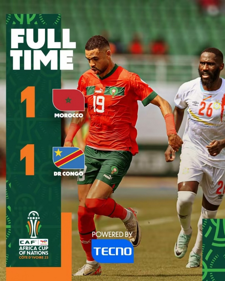 1月22日讯 北京时间1月21日22点,非洲杯小组赛F组摩洛哥对阵民主刚果。上半场,阿什拉夫凌空抽射破门,恩内斯里连续错失绝佳机会,卡马拉送点,巴坎布射失点球。下半场,瓦曼图吉卡替补扳平比分。全场比赛结束,摩洛哥1-1民主刚果。
