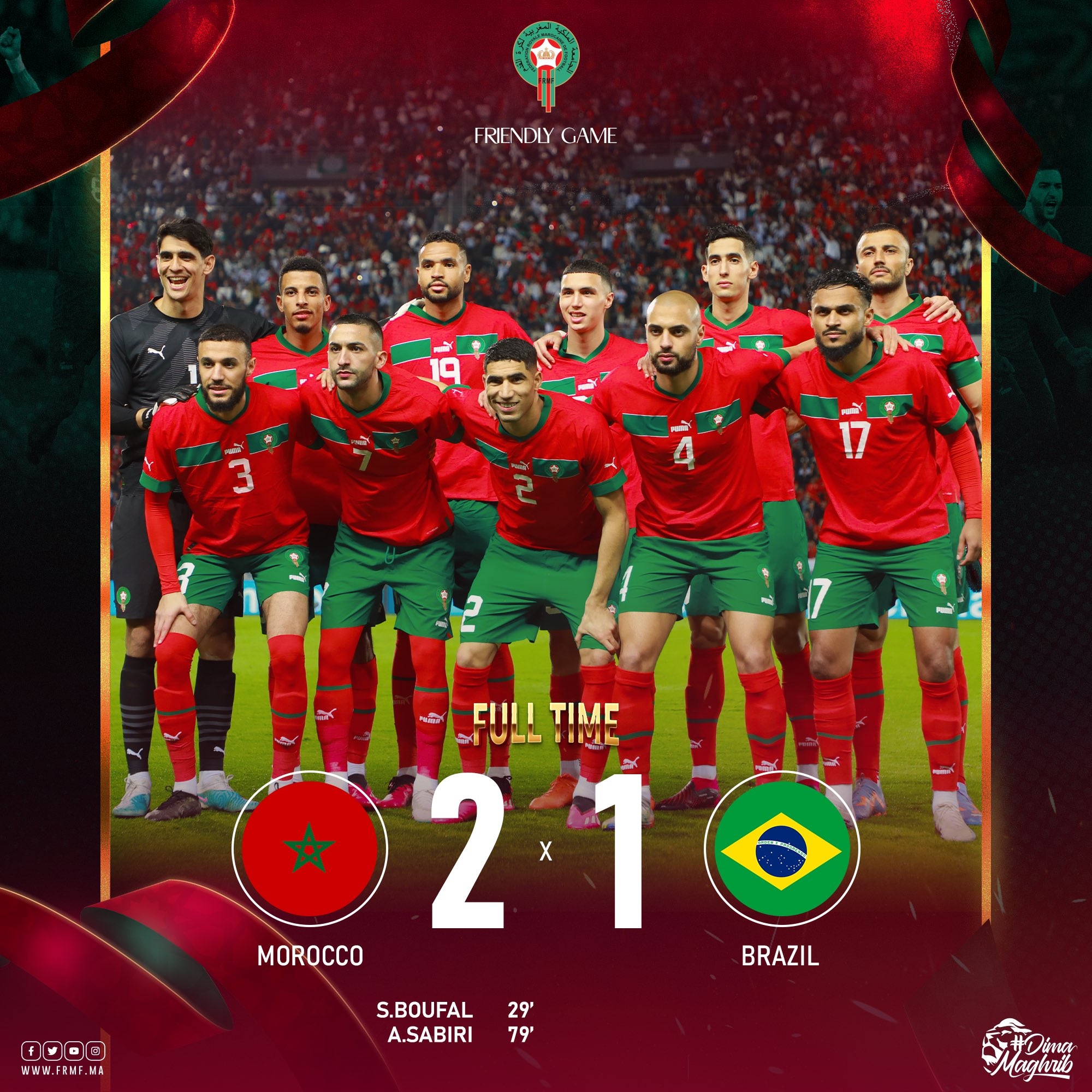 摩洛哥首发:1-布努、2-阿什拉夫(53’25-叶海亚-阿拉)、3-马兹拉维、5-阿格尔德、6-塞斯、4-阿姆拉巴特、8-欧纳希、23-汉努斯(64’11-萨比里)、7-齐耶赫、17-鲍法尔(77’16-阿布德)、19-恩内斯里(77’21-切迪拉)