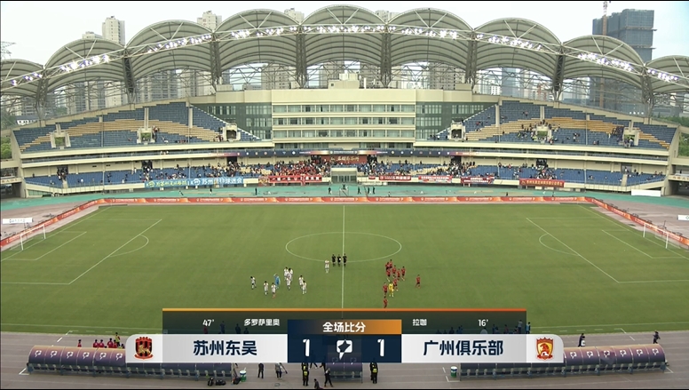 上半场补时2分钟,苏州东吴1-1广州。