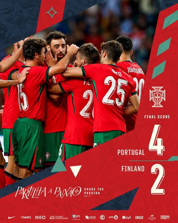 6月5日讯 北京时间6月5日02:45,国际友谊赛葡萄牙迎战芬兰的比赛,本场比赛C罗缺席,上半场维蒂尼亚助攻迪亚斯头球首开记录,孔塞桑造点若塔点射扩大比分,下半场孔塞桑助攻B费世界波破门,普基替补双响,B费推射锁定胜局,最终葡萄牙4-2芬兰。