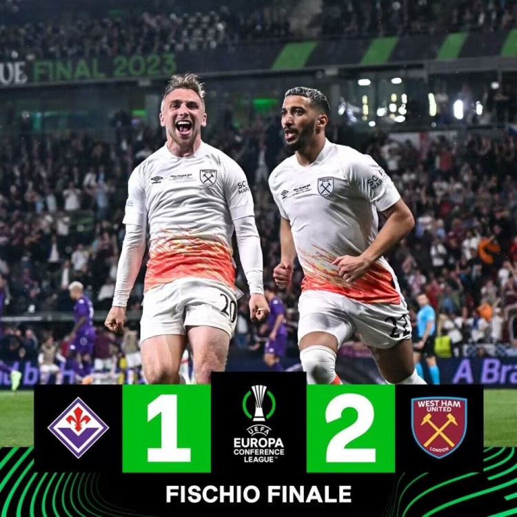 6月8日讯 北京时间6月8日凌晨3点整,2022-23赛季欧会杯决赛在布拉格伊甸园体育场展开角逐,佛罗伦萨对阵西汉姆联。上半场约维奇进球被吹越位,下半场比拉吉手球送点,本拉赫马点射打破僵局,博纳文图拉扳平比分,鲍文单刀绝杀。最终西汉姆联2-1战胜佛罗伦萨夺冠,西汉姆时隔58年再次夺得欧战冠军。