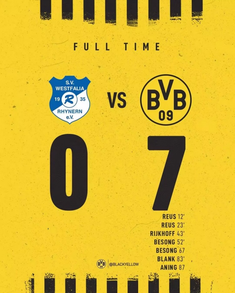 友谊赛-罗伊斯&贝松均2射1传 多特蒙德7-0大胜第5级别球队