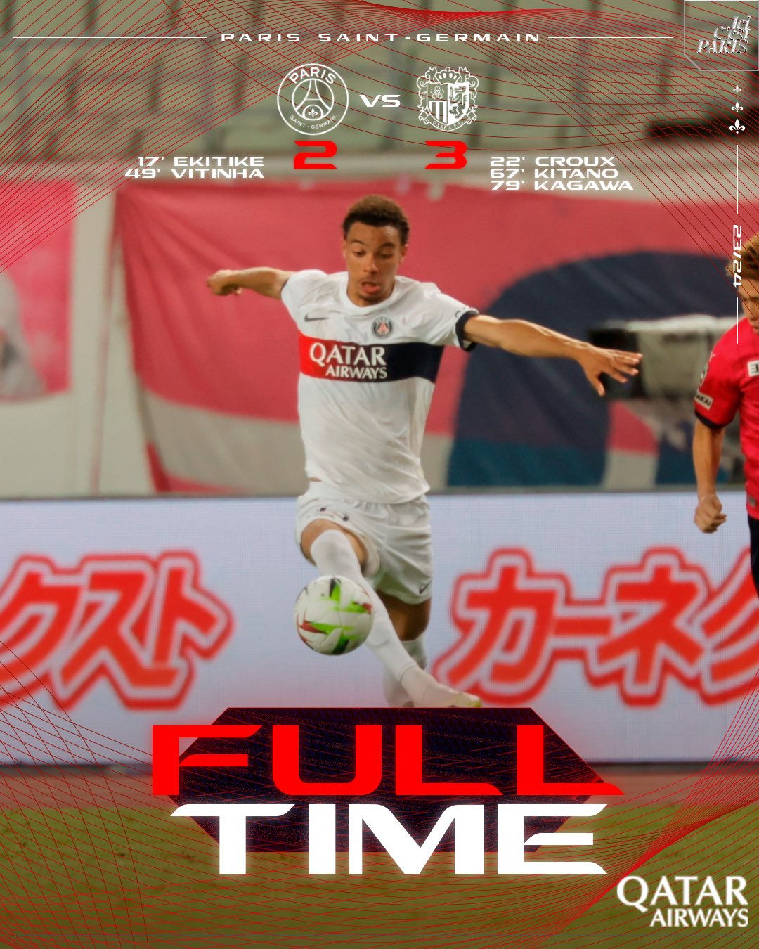下半场补时2分钟,最终全场比赛结束,巴黎2-3大阪樱花。