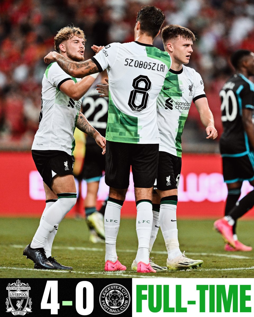 7月30日讯 北京时间7月30日下午17点整,2023年国际足球友谊赛在新加坡展开角逐,利物浦对阵莱斯特城。上半场努涅斯补射首开纪录,克拉克和若塔扩大比分,萨拉赫两送助攻,下半场多克头球破门,最终利物浦4-0大胜莱斯特城。